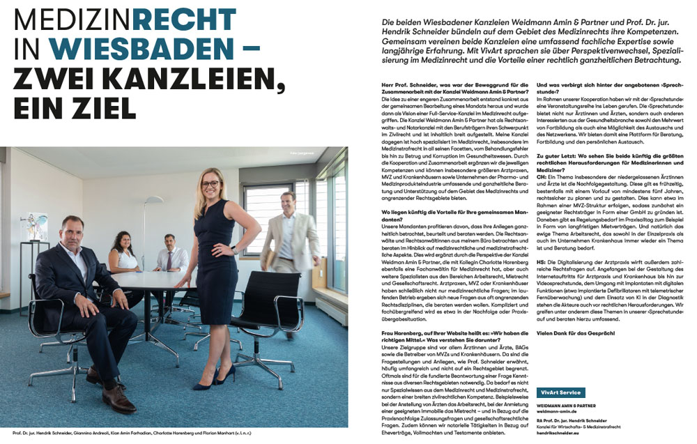 Zwei Kanzleien ein Ziel – Lesen Sie den Artikel in der aktuellen Vivart 9/25 zum Thema Medizinrecht Wiesbaden.
